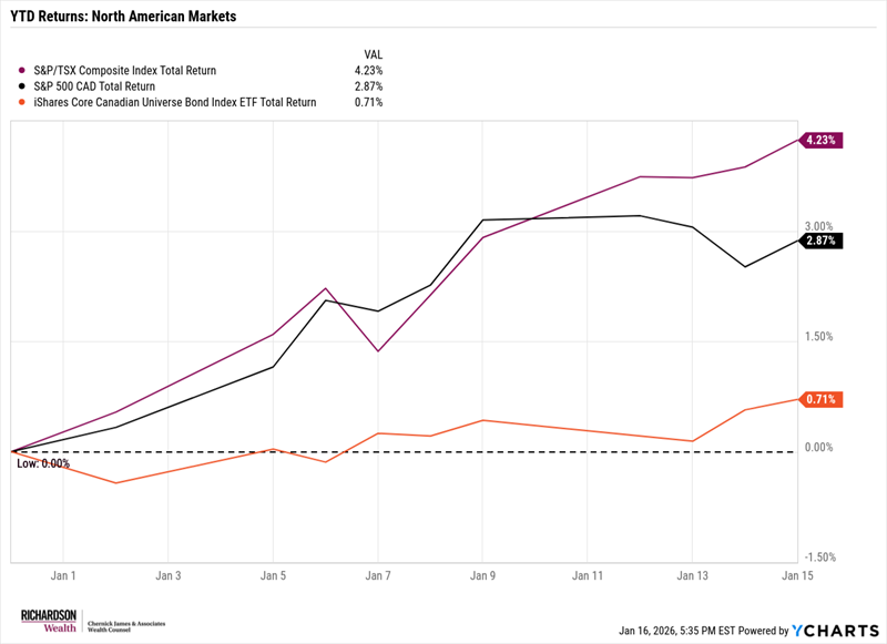 Looking ahead, we’re entering 2026 from a place that feels familiar. Our outlook remains positive, grounded in the belief that earnings strength is the foundation of market performance - and that strength looks poised to continue, fueled by ongoing technological innovation. We continue to see AI as a long-term driver of capital investment (fueling broader GDP growth) and corporate margin expansion (supporting share price growth), even if sentiment wavers from time to time. And, as the chart below shows, markets are off to a strong start this year - an encouraging sign as these themes continue to unfold.