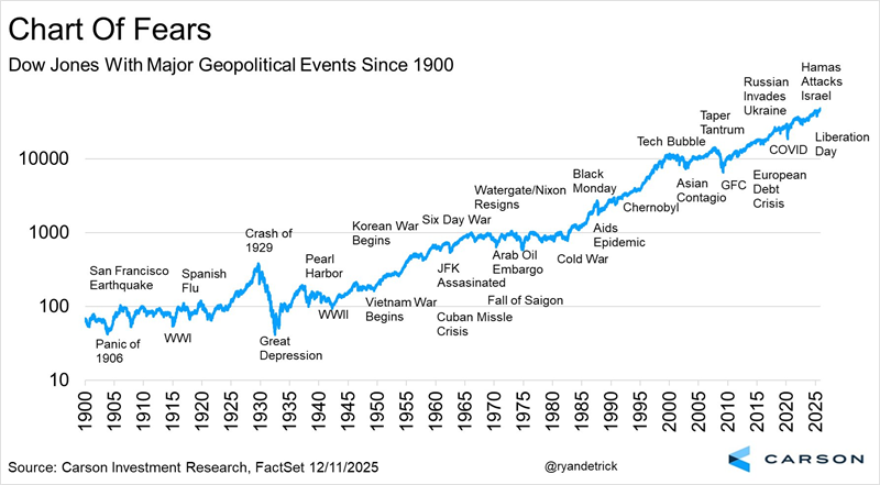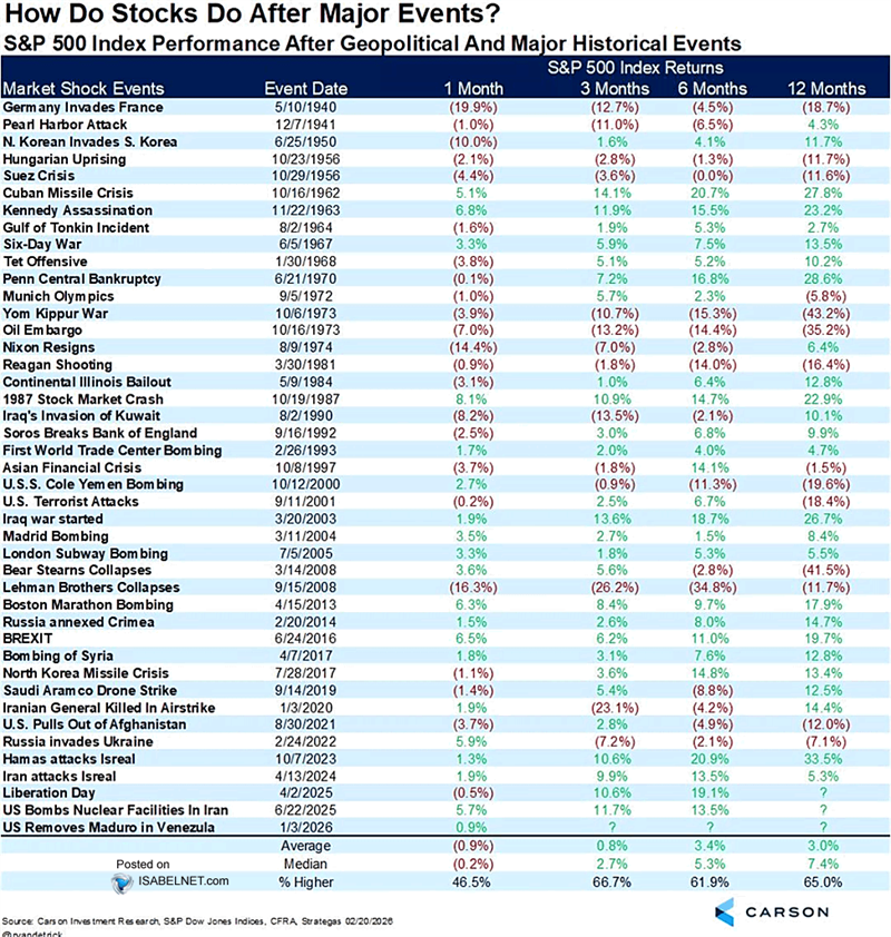 We have seen this pattern before. Geopolitical shocks tend to prompt an immediate market reaction, but over time markets adjust as clarity improves. The charts below, courtesy of Ryan Detrick at Carson Investment Research, help put that into context. Following major geopolitical events since World War II, the S&P 500 has delivered a median gain of 5% six months later, despite often being unsettled in the early days:
