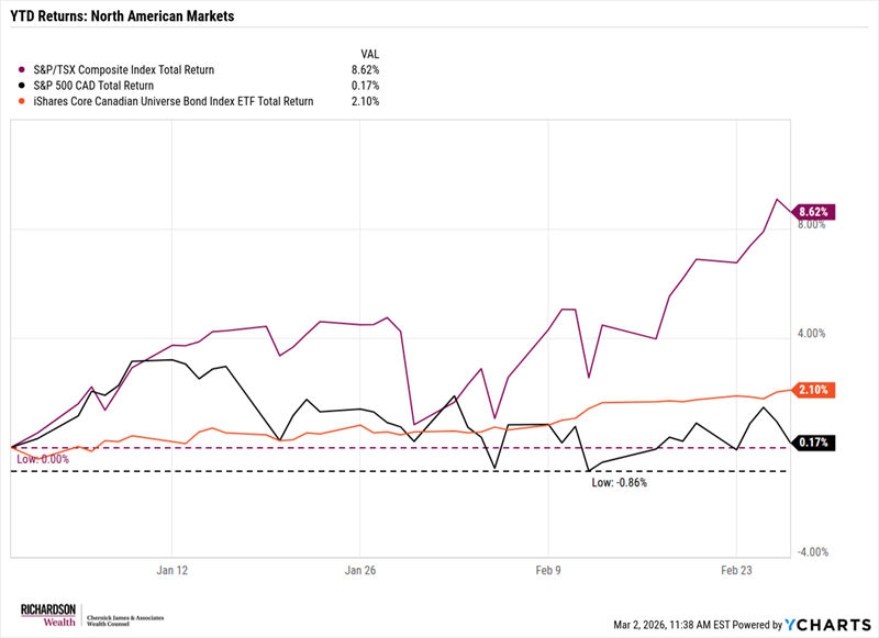At a glance, you might look at the chart above and think markets do not appear especially unsettled - and at a high level, that would be fair. Canadian equities have quietly put together another strong start to the year, supported by strength in energy and precious metals. Meanwhile, U.S. markets have been flatter, with modest weakness concentrated in more technology-heavy areas. Nothing severe. Nothing disorderly. But enough movement beneath the surface to warrant a closer look. It is that beneath-the-surface activity that has really defined February.